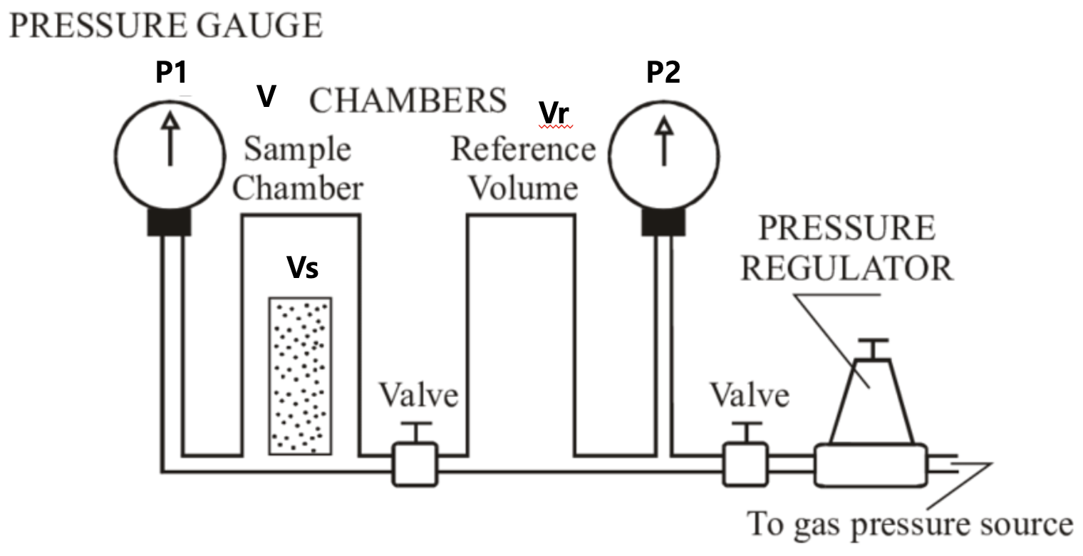 구하고자 하는 고체 부피를 포함한 코어가 담긴 알고 있는 부피의 Chamber로부터 부피를 알고 있는 Chamber로 기체가 팽창한다.